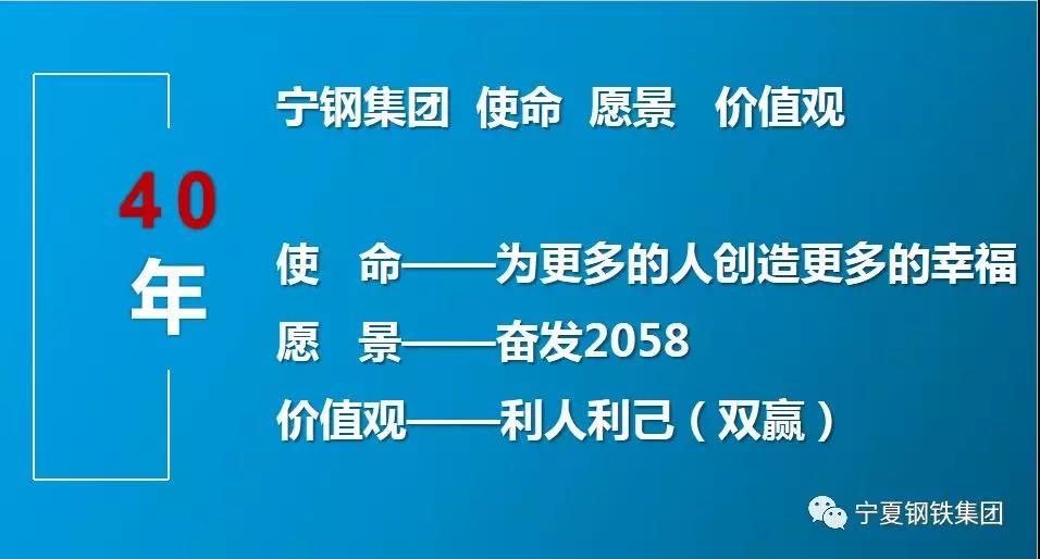 董事長曹廣江說:集團(tuán)今天的發(fā)展,自己真是集萬千寵愛于一身。寧夏紅是寧夏人的寧夏紅,寧鋼是寧夏人的寧鋼。寧鋼集團(tuán)發(fā)展的這60年,不是我一個(gè)人干出來的,是寧鋼集團(tuán)三千兄弟姐妹們一起干出來的;寧鋼的歷史文化,不是我說出來的,是寧鋼人一步一步走到今天沉淀下來的。創(chuàng)業(yè)的路很艱辛,每天都在奔跑,真是九死一生才有了今天!我就是想讓寧鋼人都過的幸福,能自豪的說——我是寧鋼人!