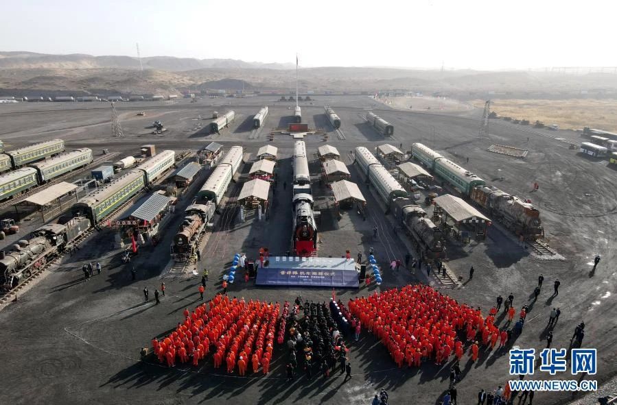 寧夏中衛(wèi)市寧夏鋼鐵集團(tuán)“時代光耀”老火車博物館,“雷鋒號”機(jī)車揭幕紀(jì)念儀式現(xiàn)場。(3月5日攝,無人機(jī)照片)